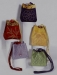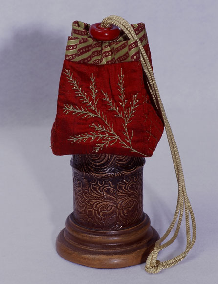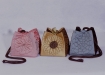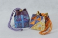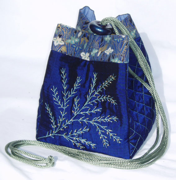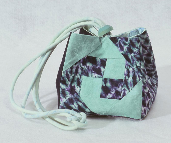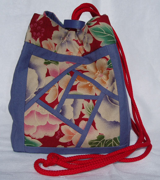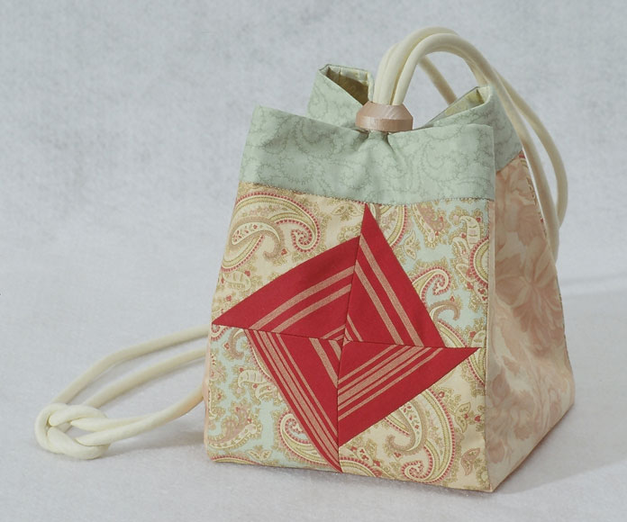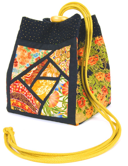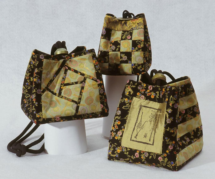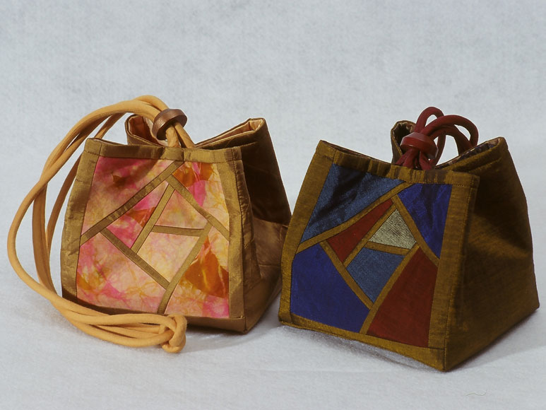 These original size bags are on the pattern cover. Beginning clockwise from the lower left is a double pinwheel block, next is a bordered bag made from whole cloth silks and sashiko quilted, and the last bag employs the original paper-pieced square rose design included in the pattern. All the bags utilize matching covered cording, and painted wooden domed slides.