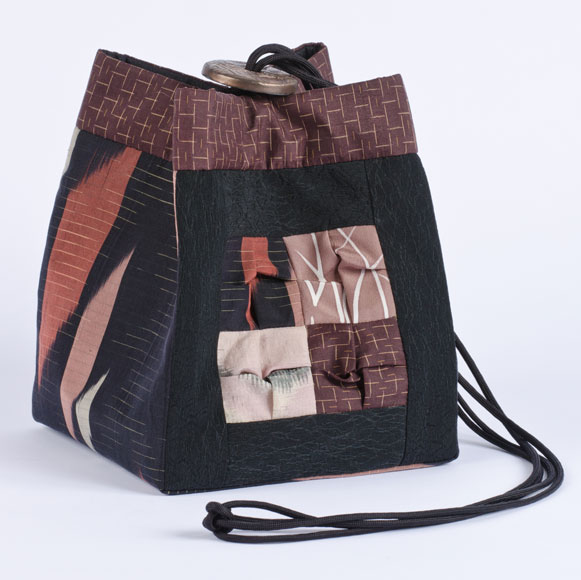 This original size Box Bag is made with vintage kimono silk fabrics. The squares of the Box Bag are a perfect opportunity to try out techniques like this fabric manipulation. This fabric folding method was used on a bag I saw in Japan, and I just loved the look. The black finely woven bolo cording closes the bag with a coordinating textured slide.