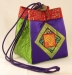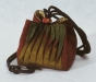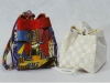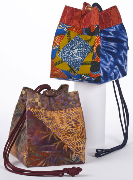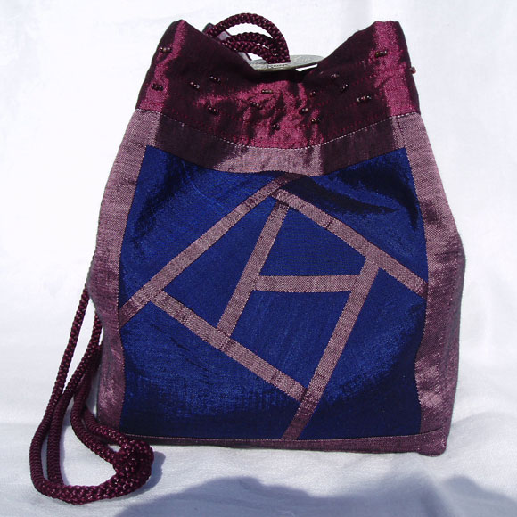 This bag can look formal or funky depending on your fabric choices. The bordered original size bag on the left is made from West African print fabrics. The purse on the right is pin woven silk dupioni, and was designed for a wedding party.
