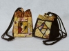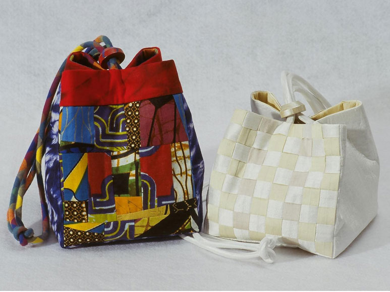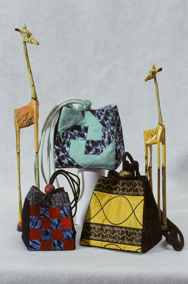 Make the bags in African fabrics. Starting clockwise from bottom left is a 16-patch bordered mini bag sewn in West African indigo tie-dyed cotton and red silk dupioni fabrics, next is an original size snail’s trail quilt block bag sewn in tie-dyed cotton damask called Bazin from Mali, and the front of the next original size bag is made with wax printed cotton cloth from Cote D’Ivoire. Slides are painted or dyed to match fabrics.