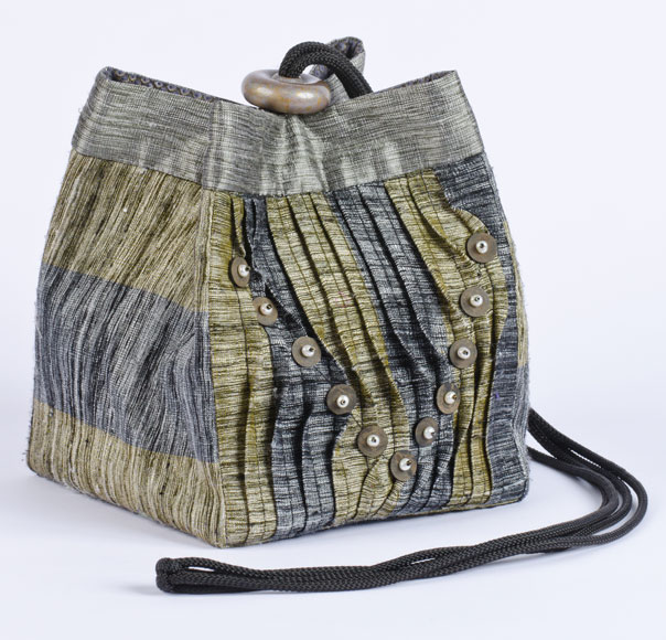 This original size Box Bag with a border is made with washed silk dupioni. The front of the bag is pintucked. Each pintuck is then turned and held in place coconut shell and pearl beads. A braided black bolo cord pulls the bag together with a hand-painted wood slide.