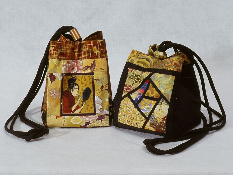 These Asian inspired bags utilize domestic and imported Japanese fabrics. The bordered bag on the left has a pieced center motif, and a creative slide made of copper pipe. The other bag is made with the original paper-pieced square rose design included in the pattern.