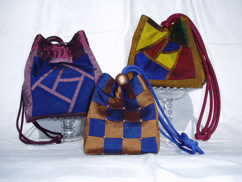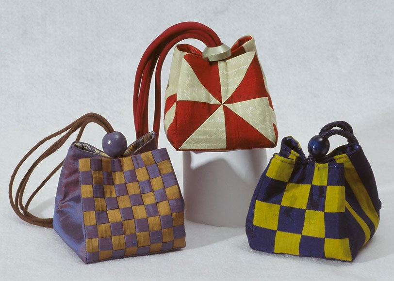 Here are three mini bags. Starting clockwise from left is a pin woven bag in dupioni silks, the next bag employs a combination of red silk dupioni and cotton print fabrics with the pinwheel quilt block included in the pattern, and the next bag is sewn with Thai silks utilizing the 16-patch block included in the pattern.