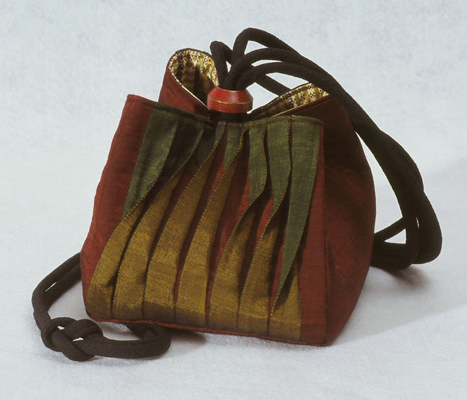 There is no end to how creative you can be by using different sewing techniques. Burmese silks are used in this example of dimensional patchwork. Strips of contrasting fabrics in gold and green are inserted between strips of the red base fabric, and then twisted.