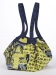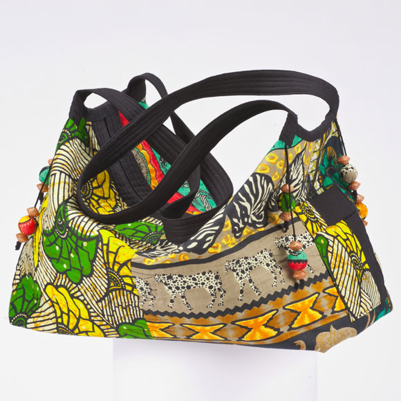 The Swag Bag is made with three African cotton print fabrics with black fabric for the zipper placket and straps. Fabric covered and wooden beads are used in place of the fabric buds.