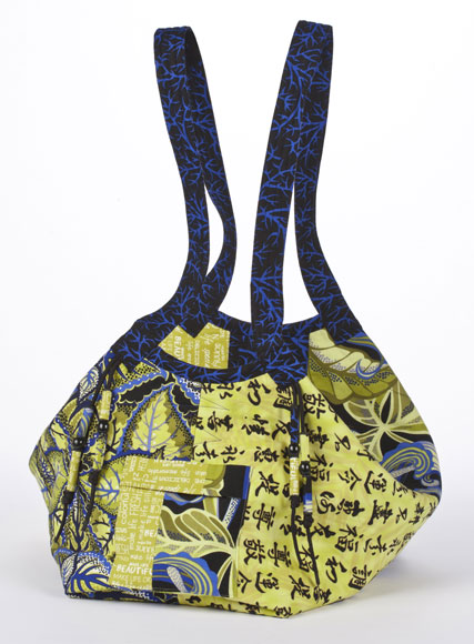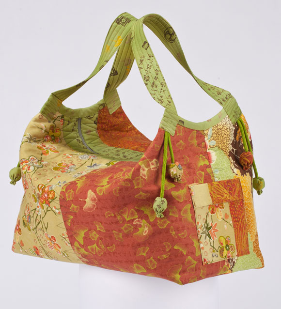 This Swag Bag is made with 5 contrasting Japanese inspired cotton fabrics. Fabric buds (instructions in pattern) are used to embellish the bag. This illustrates one strap attachment option; connecting the ends of one binding strip.
