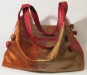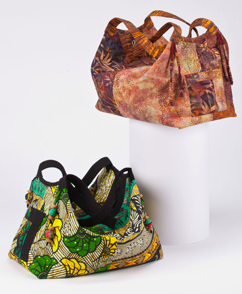 Illustrated are two Swag Bags in African cotton (lower bag) and batik cotton fabrics (upper bag.) These two Swag Bags illustrate the two different ways to connect the straps to the bag.